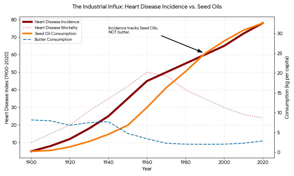 The “heart-healthy” advice of the last 60 years told us that saturated fat causes heart disease. But as the butter disappeared from Australian tables, the sickness didn’t stop, it accelerated. The only thing that tracks the actual rise in cases is the 3,000% increase in industrial seed oil consumption.